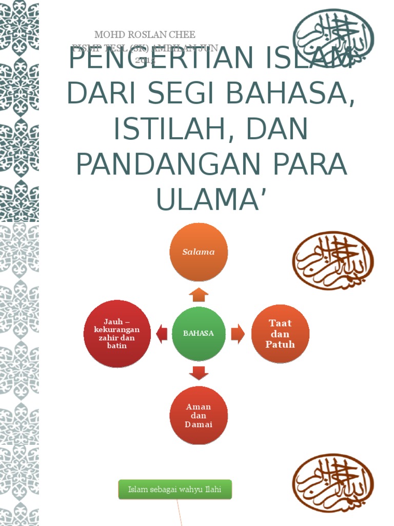 Pengertian Islam Iman Dan Ihsan Wla 104 03 Pengajian Islam from pengajianislam.pressbooks.com Dari segi bahasa ,taharah ialah suci dan bersih daripada segala kekotoran dan kecemaran, sama ada pada hissi (suatu yang dapat disentuh dan dilihat) atau maknawi (suatu yang tidak dapat dilihat atau disentuh). Adapun kata dalam bahasa arab lainnya yang berarti maaf adalah aasif. Manakala dari segi istilah syarak, islam ialah tunduk, taat dan patuh kepada perintah allah s.w.t. Lalu kata salima tersebut diubah menjadi bentuk aslama yang berarti berserah diri masuk kedalam kedamaian. Hal ini menunjukkan bahwa seorang pemeluk islam merupakan seseorang yang secara ikhlas menyerahkan jiwa dan raganya hanya kepada allah swt. Sebagai umat muslim kita juga dilarang untuk membicarakan aib diri sendiri. Pengertian islam menurut bahasa, kata islam berasal dari kata aslama yang berakar dari kata salama. Dalam bahasa inggris ditulis dengan method, dalam bahasa arab diterjemahkan dengan thariqat dan manhaj, serta dalam kbbi, mengandung arti cara yang teratur untuk mencapai suatu maksud jika dilihat dari segi kecenderungan para mufassir, metode tahlili terbagi menjadi tujuh bagian, yaitu.
